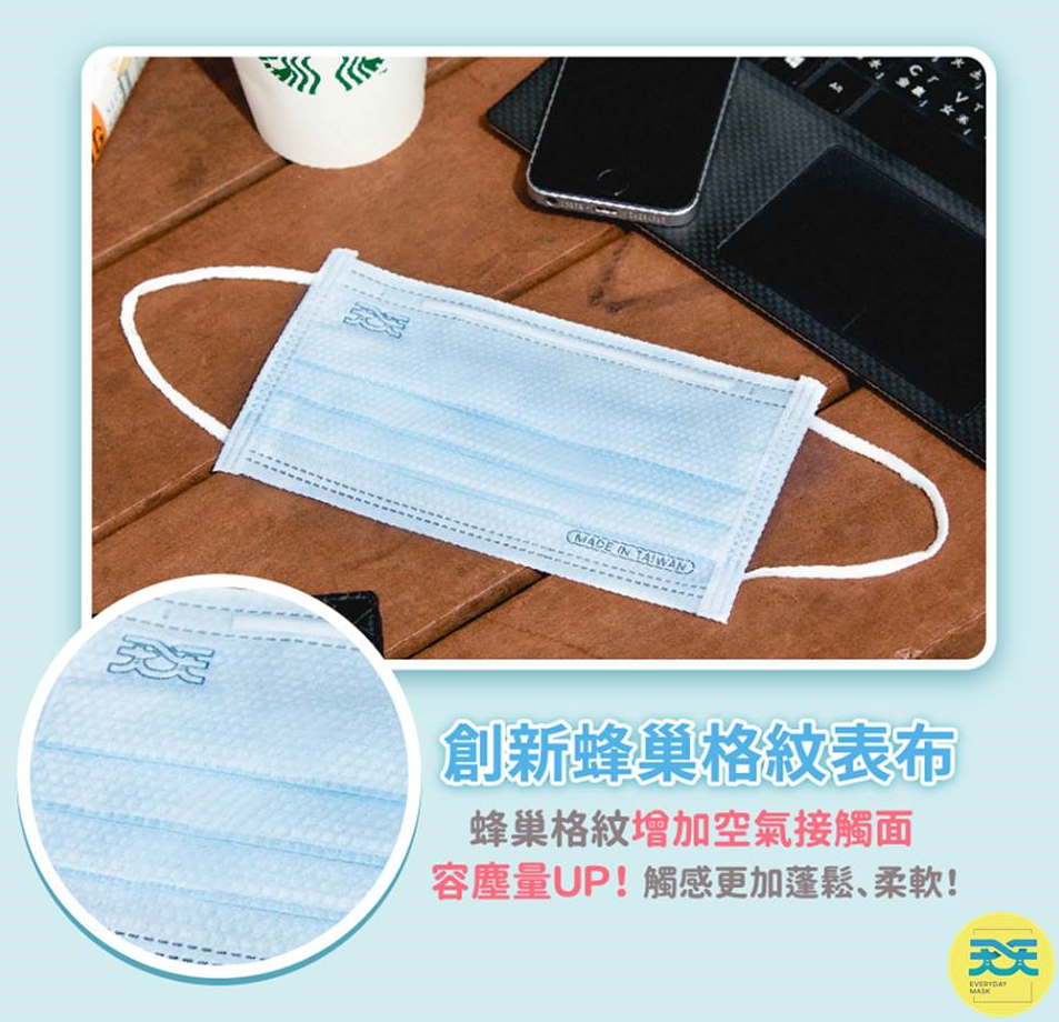 天天防護口罩採用蜂巢格紋,擴大表布接觸面,提高容塵量。