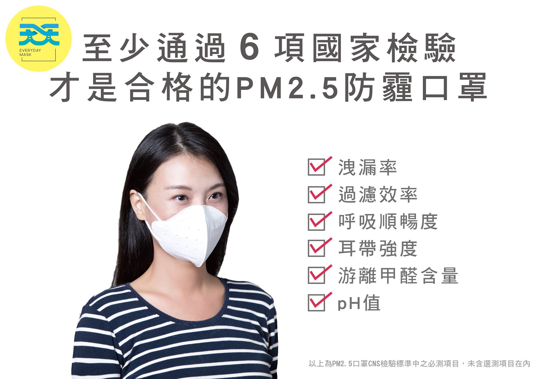 合格的PM2.5口罩至少要通過 6 項 CNS15980 國家檢驗,才具備有效防護。購買時請認明是否有 6 項檢驗,並查詢廠商的合格證書,以確保買到合格口罩。 天天通過CNS15980的檢測證書>> https://goo.gl/mAJQZr 未取得6項國家認證,絕不宣稱自己有PM2.5防護! 「天天PM2.5專業防霾口罩」,給你最專業、誠實的防護!