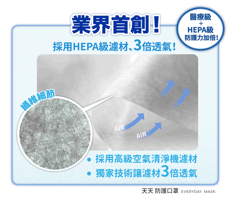 天天防護口罩,首創將高級空氣清淨機使用的HEPA(High Efficiency Particulate Air Filter)高效過濾濾材導入口罩中! 過濾效能提高了,透氣性還升級 3倍,配戴口罩更加舒適、不悶熱!